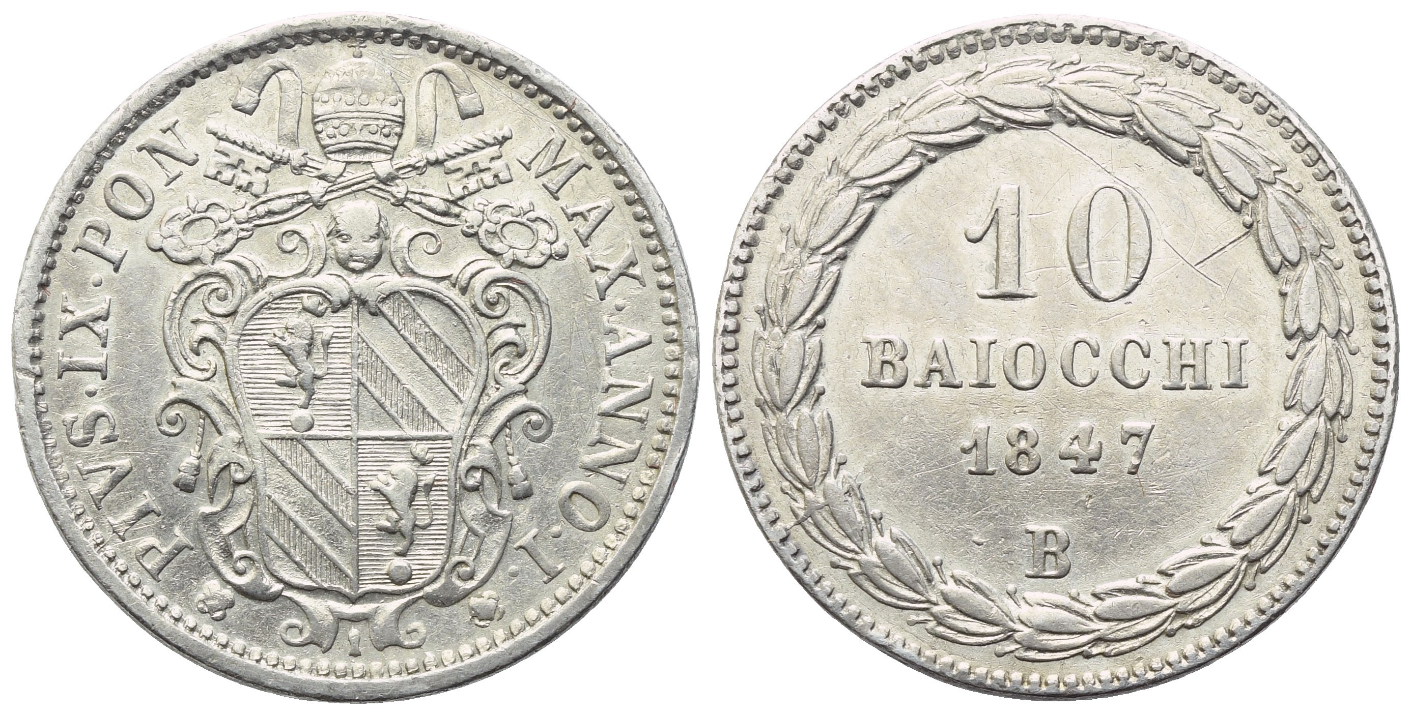 PIVS IX PON MAX ANNO I Stemma sormontato da chiavi e tiara; Rv. 10 / BAIOCCHI / 1847 / B entro corona di lauro. Gig. 110. Raro. SPL+. Graffietti.