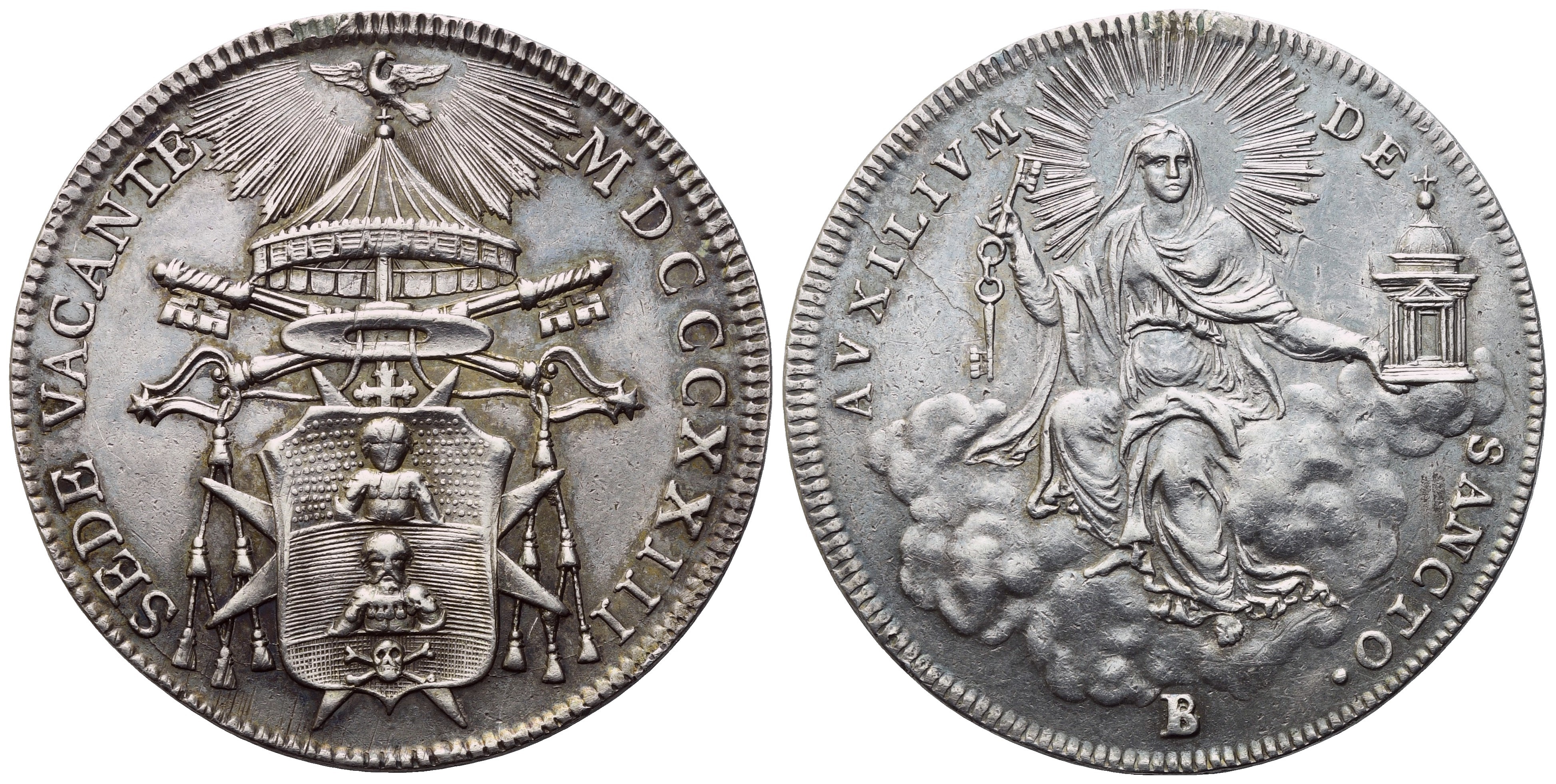 SEDE VACANTE MDCCCXXII Stemma su croce di Malta sormontato da galero, chiavi, padiglione e colomba raggiante. Rv. AVXILIVM DE SANCTO La Chiesa, seduta tra le nubi, con chiavi e tempio; in basso, B. Gig. 5; Mont. 151; Pag. 113. qFDC. Minime tracce di appiccagnolo.