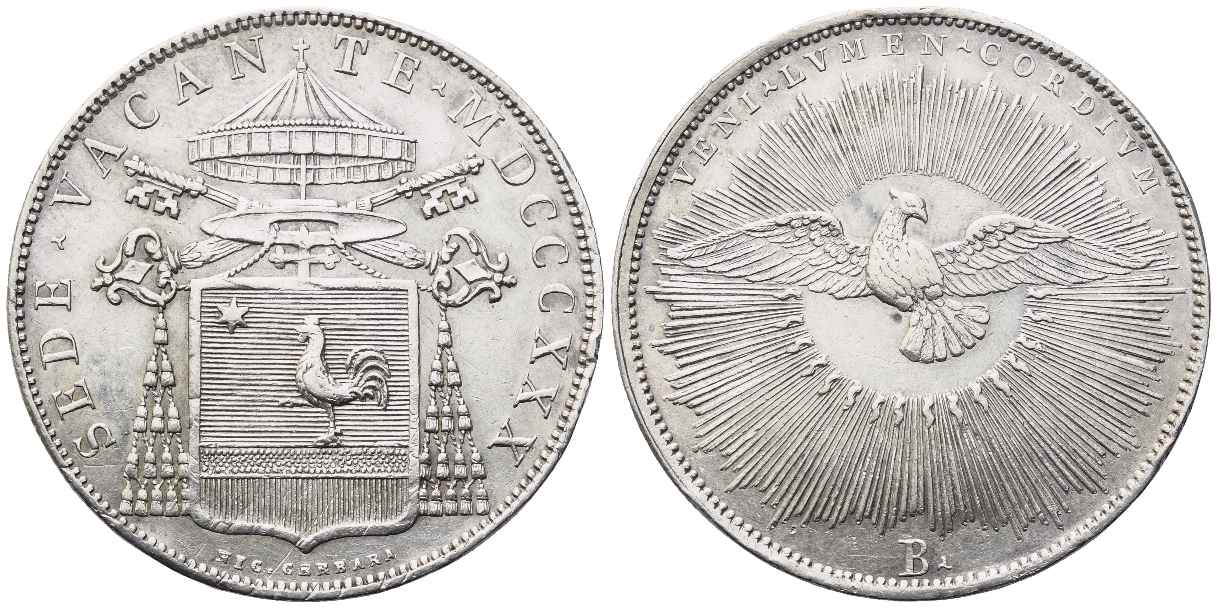 SEDE VACANTE MDCCCXXX Stemma sormontato da galero, chiavi e padiglione; in basso, NIC CERBARA. Rv. VENI LVMEN CORDIVM Colomba ragiante in volo; in basso, B. Munt. 4; Pag. 128; Gig. 3; B. 3295. BB+/qSPL