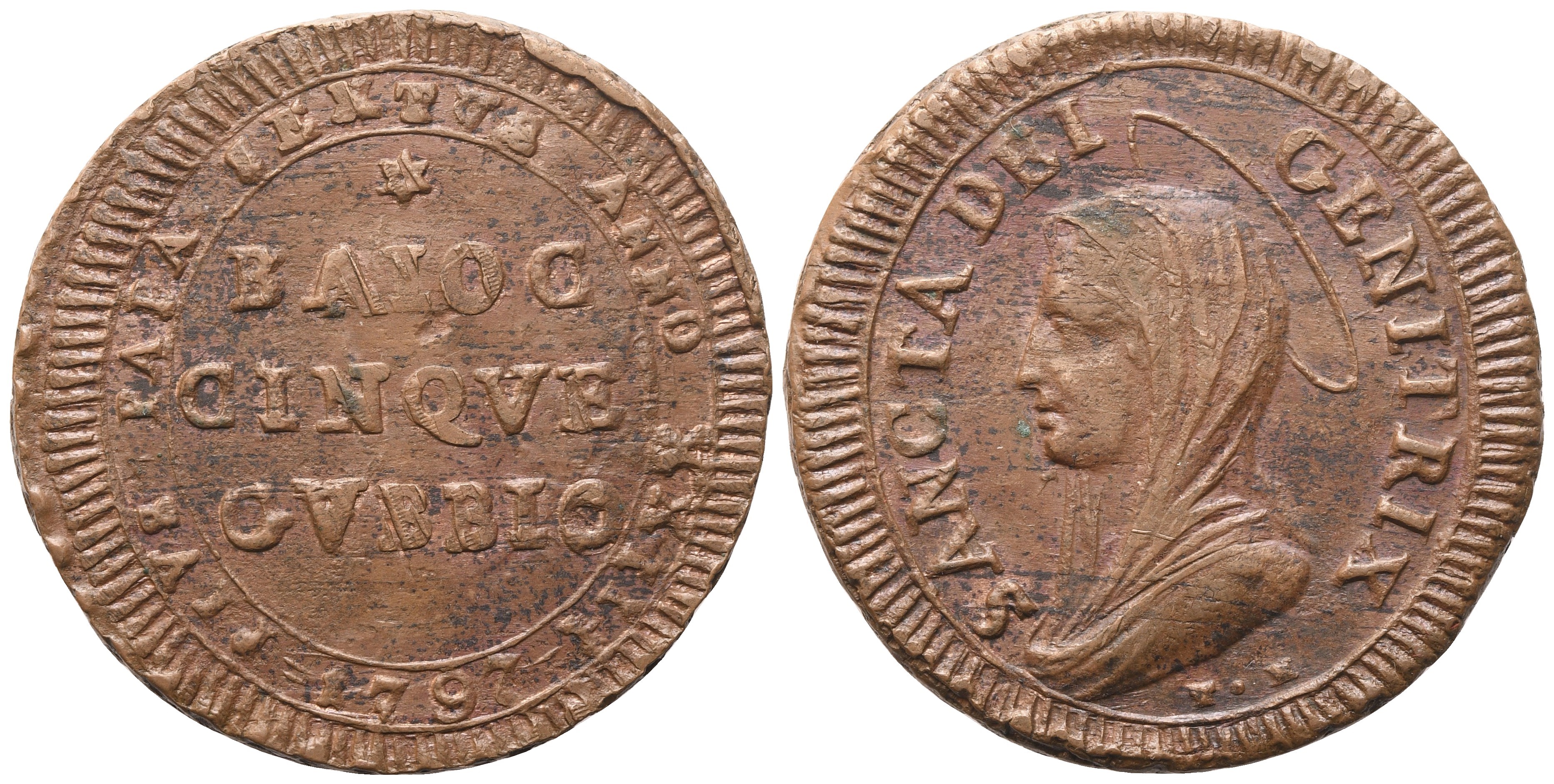 PIVS PAPA SEXTVS ANNO XXIII Nel campo BAIOC / CINQVE / GVBBIO su tre linee. Sotto, nel giro, 1797. Rv. SANCTA DEI – GENITRIX Busto della Beata Vergine a s. nimbato e velato; sotto, T M (Tommaso Mercandetti, incisore). Muntoni 351; Berman 3106; MIR 2944/2. qSPL. Gradevole patina marrone.