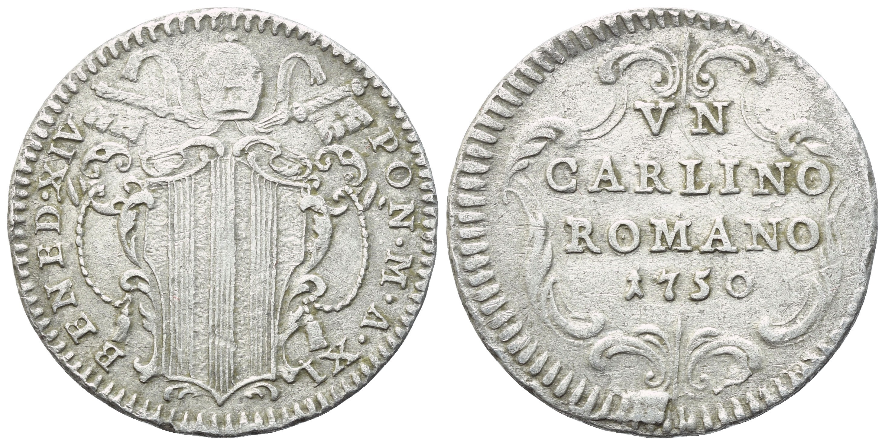 BENED XIV PON M A XI Stemma sormonto da triregno e chiavi decussate. Rv. VN / CARLINO / ROMANO / 1750 entro cartella. Munt. 156b. R2. qSPL