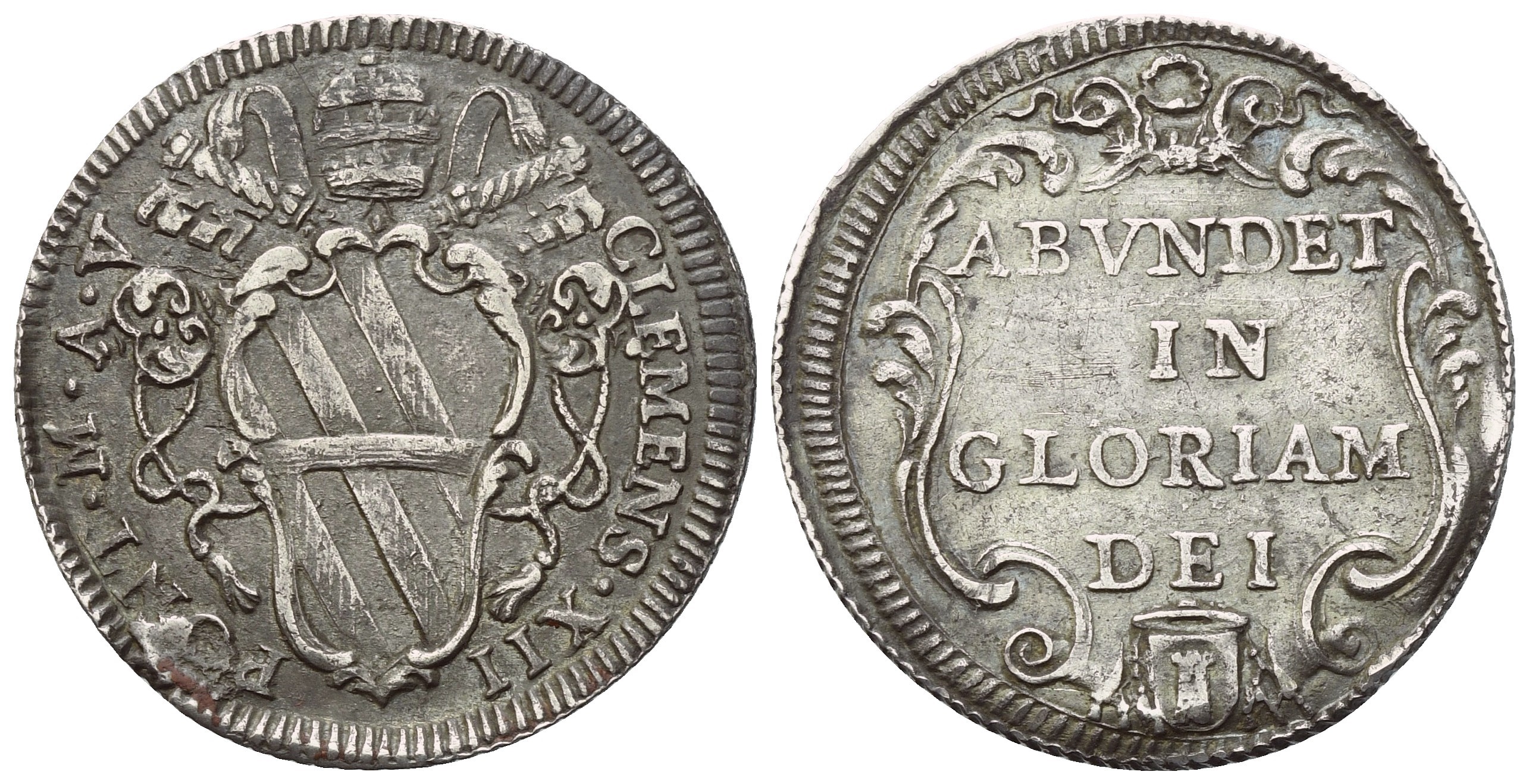 CLEMENS XII PONT M A V Scudo sormontato da tiara e chiavi decussate. Rv. ABVNDET / IN / GLORIAM / DEI entro cartella rettangolare a fogliami, conchiglia in cimasa e chiusa in basso da armetta Casoni. Munt. 106; MIR 2511/8. Raro. SPL+. Patina di collezione.