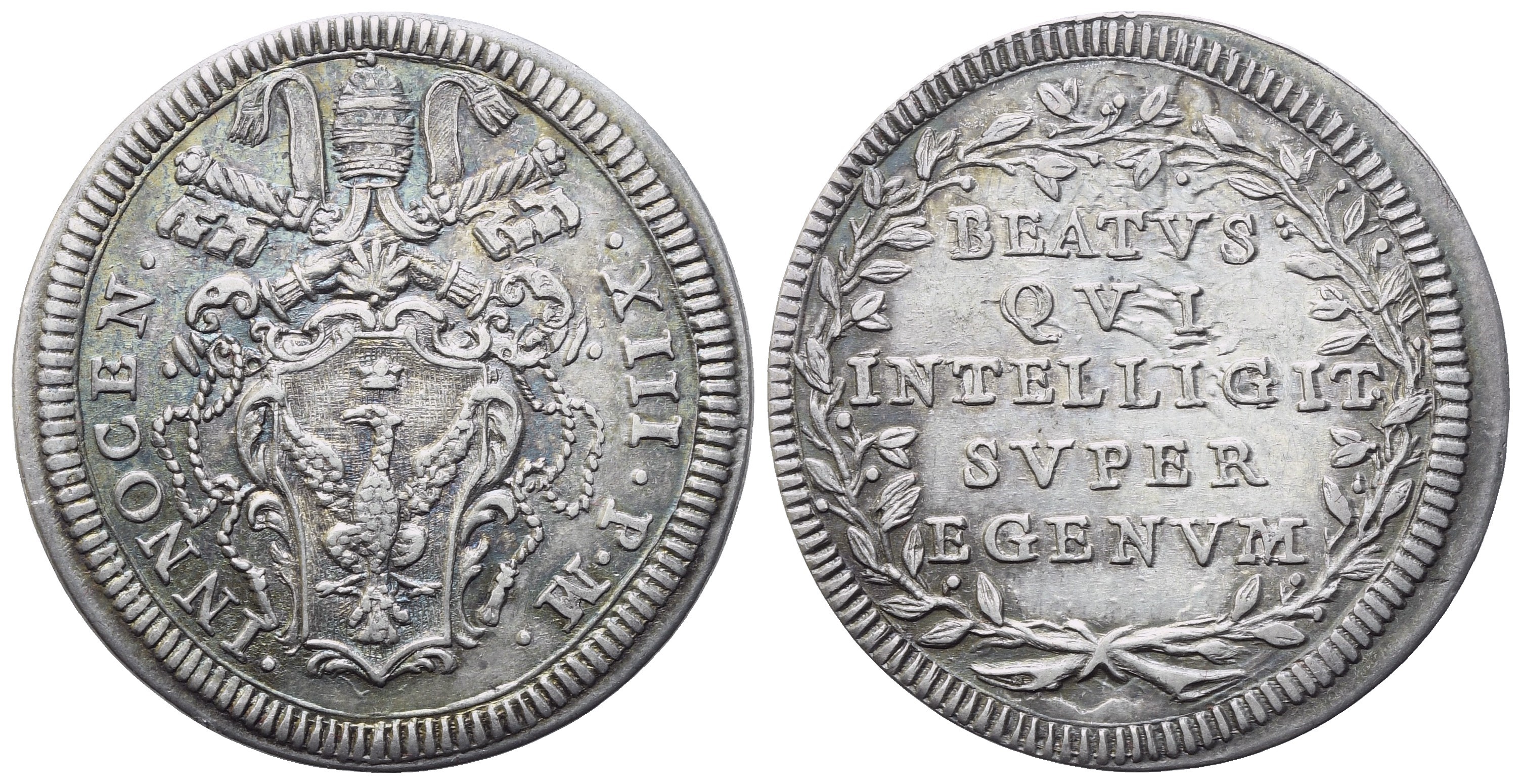 INNOCEN XIII P M Stemma sormontato da triregno e chiavi decussate. Rv. BEATVS / QVI / INTELLIGIT / SVPER/ EGENVM tra rami. Munt. 7. Raro.