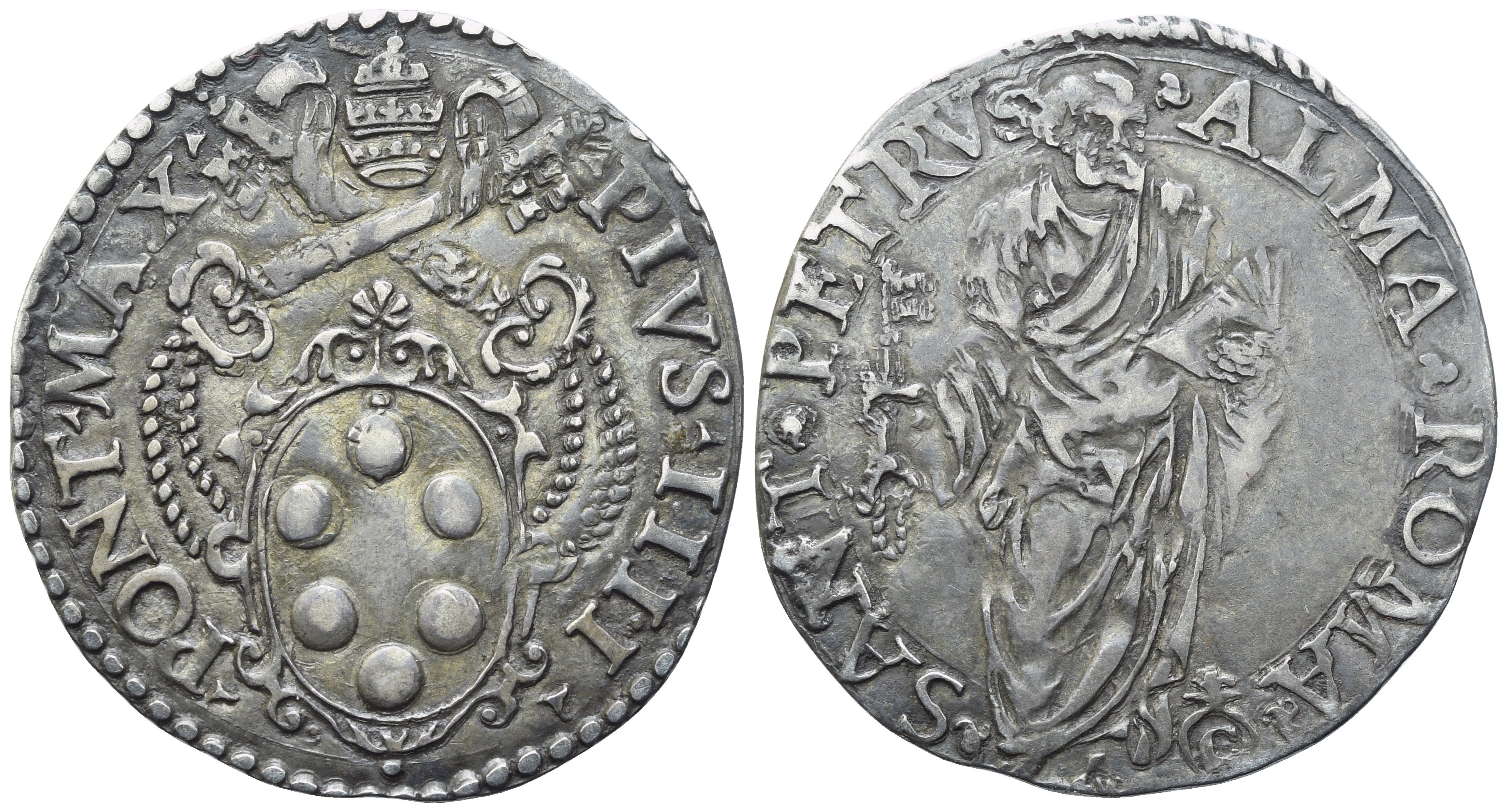 PIVS IIII – PONT MAX Stemma sormontato da triregno e chiavi decussate. Rv. S PETRVS – ALMA ROMA S. Pietro, nimbato, stante di fronte; in basso, a destra, segno di Girolamo Ceuli zecchiere. MIR 1055/3; Muntoni 17. qSPL. Patina di antica collezione.