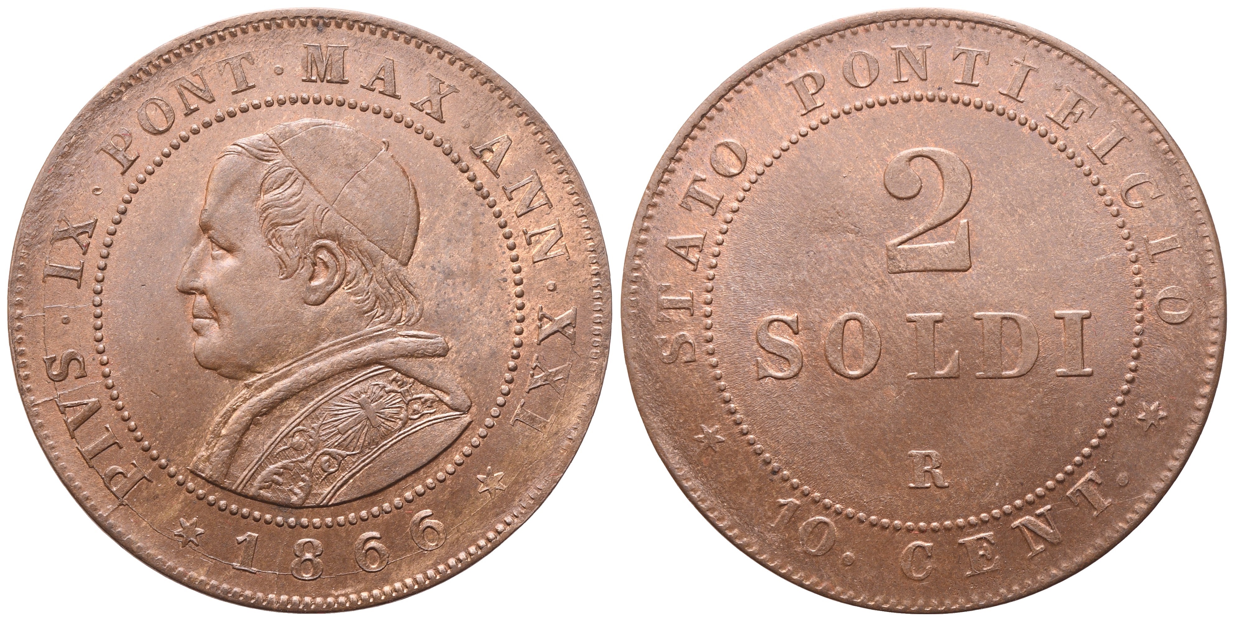 PIVS IX PONT MAX ANN XXI 1866 Busto a sinistra con zuccheetto, mozzetta e stola entro cerchio perlinato. Rv. * STATO * PONTIFICIO * 10 CENT Nel centro, 2 / SOLDI / R entro cerchio perlinato. Gig. 323. SPL+/qFDC. Patina marrone.