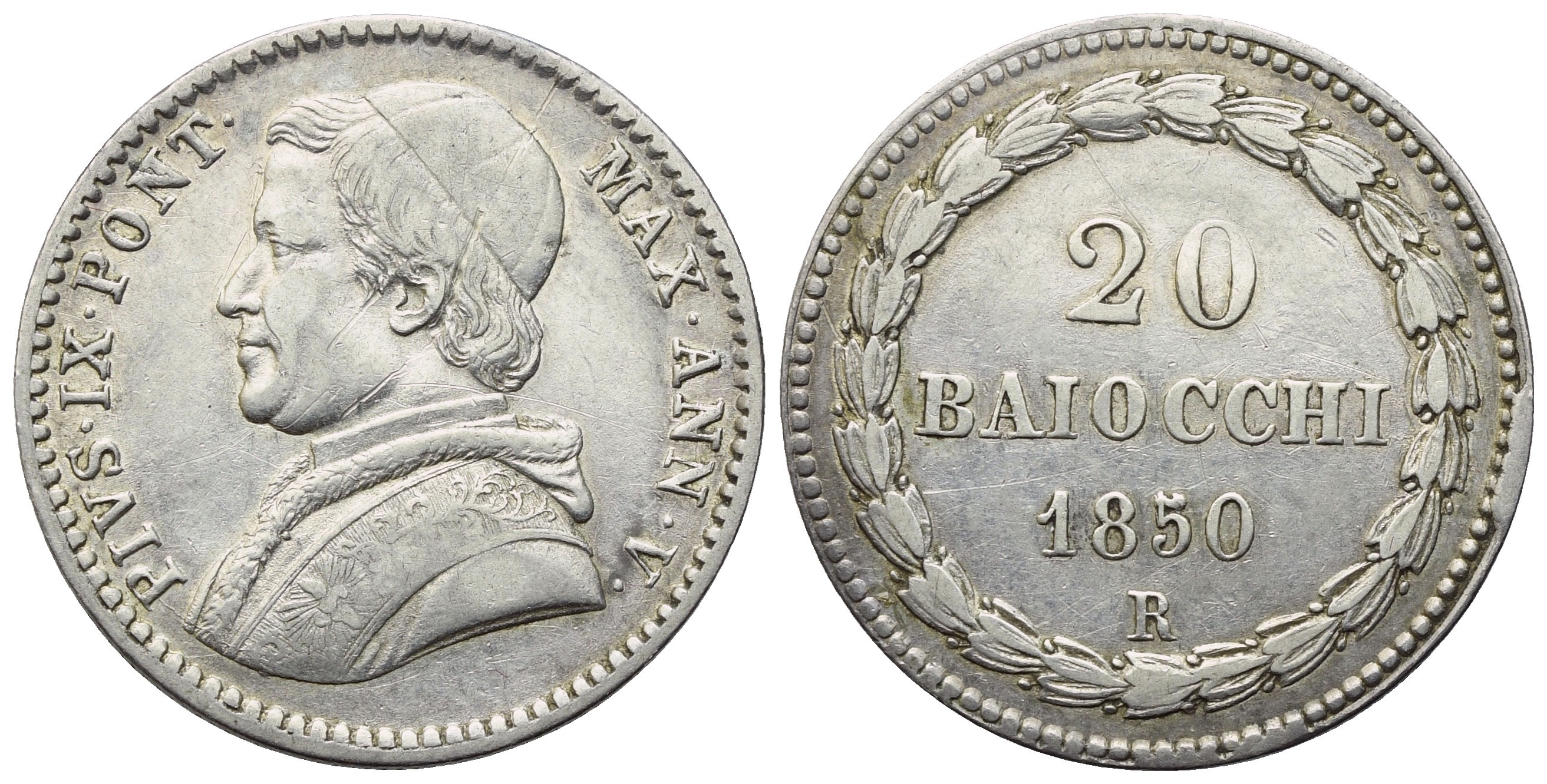 STATO PONTIFICIO. Roma. Pio IX (1846-1870). 20 Baiocchi 1850 – Anno V; Ag (5,35 g; 22,5 mm)
