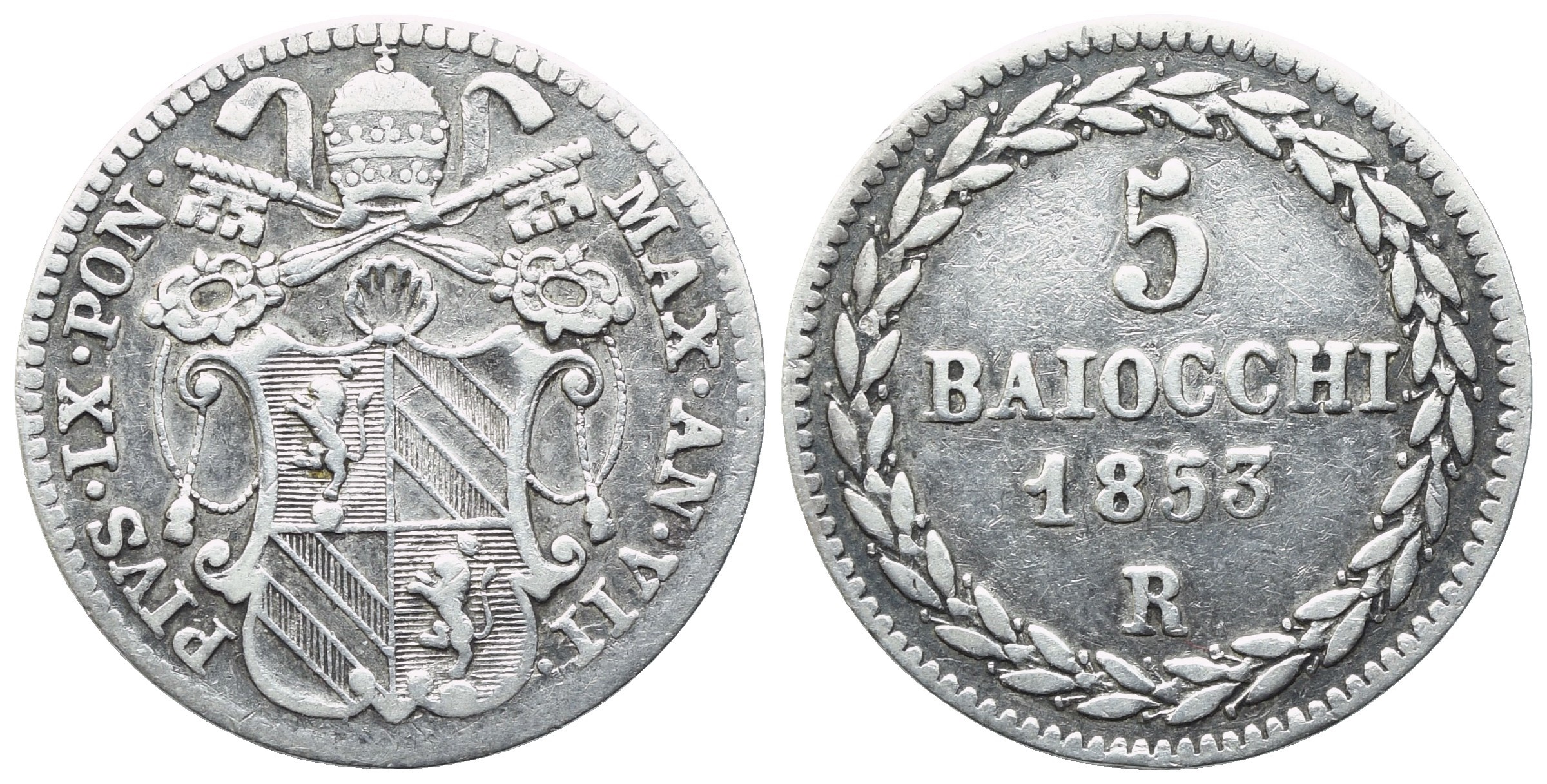 STATO PONTIFICIO. Roma. Pio IX (1846-1870). 5 Baiocchi, 1853 – Anno VII; Ag (1,32 g; 16,2 mm)
