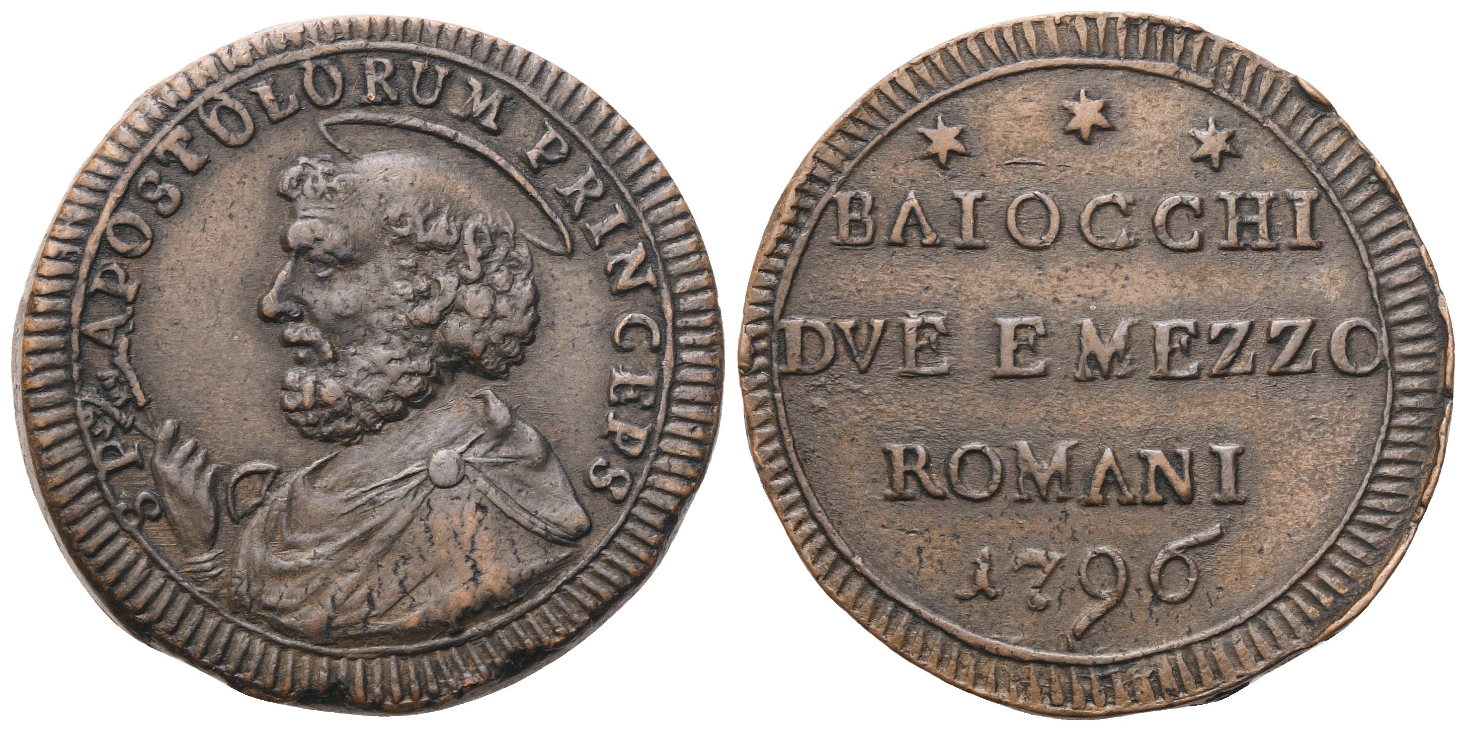 APOSTOLORUM PRINCEPS Busto dell'Apostolo Pietro a sinistra. Rv. BAIOCCHI / DVE E MEZZO / ROMANI / 1796. Iscrizione disposta su quattro righe. CNI 308; Muntoni 100. SPL. Gradevole patina marrone.
