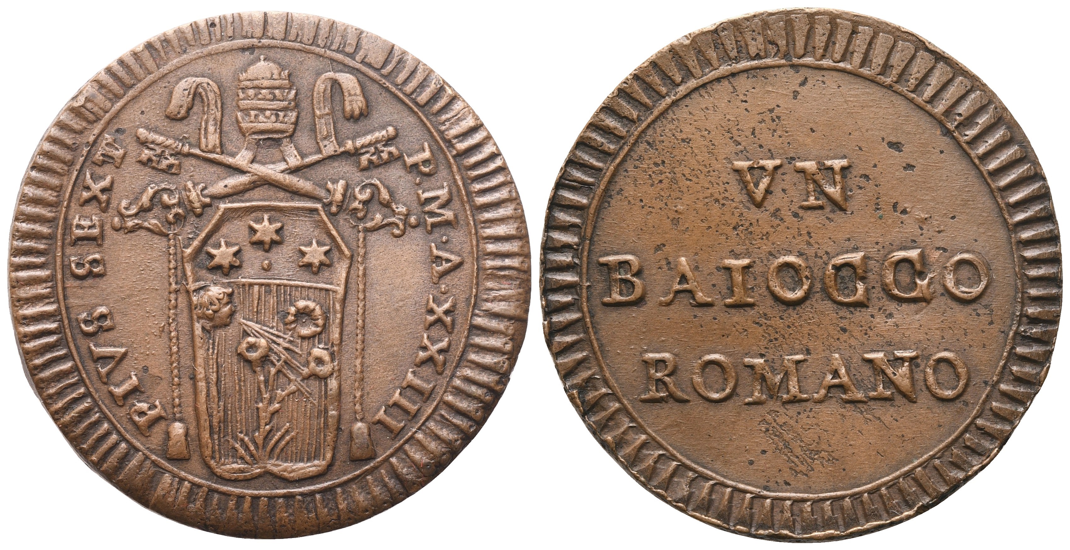 PIVS SEXT - P M A XXIII. Stemma a targa semiovale allungato sormontato da triregno e chiavi decussate. Rv. VN / BAIOCCO / ROMANO. Iscrizione entro cerchio lineare. Munt. 134; B. 2995. SPL+. Patina marrone.