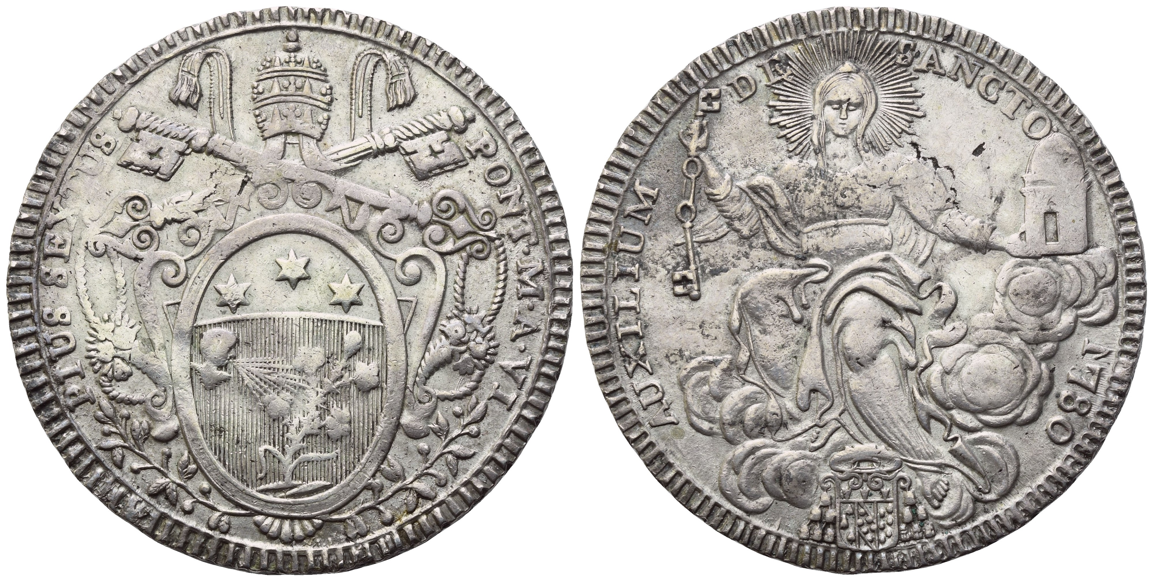 PIVS SEXTVS PONT M A VI Stemma Braschi sormontato da triregno, chiavi decussate con cordoni e fiocchi. Rv. AVXILIVM DE SANCTO 1780 La Religione su nubi, nella destra le chiavi; nella sinistra, tempietto; in basso, armetta Vai. Muntoni 17; CNI 61; Berman 2958; Davenport 1471. Molto raro. BB+/qSPL.