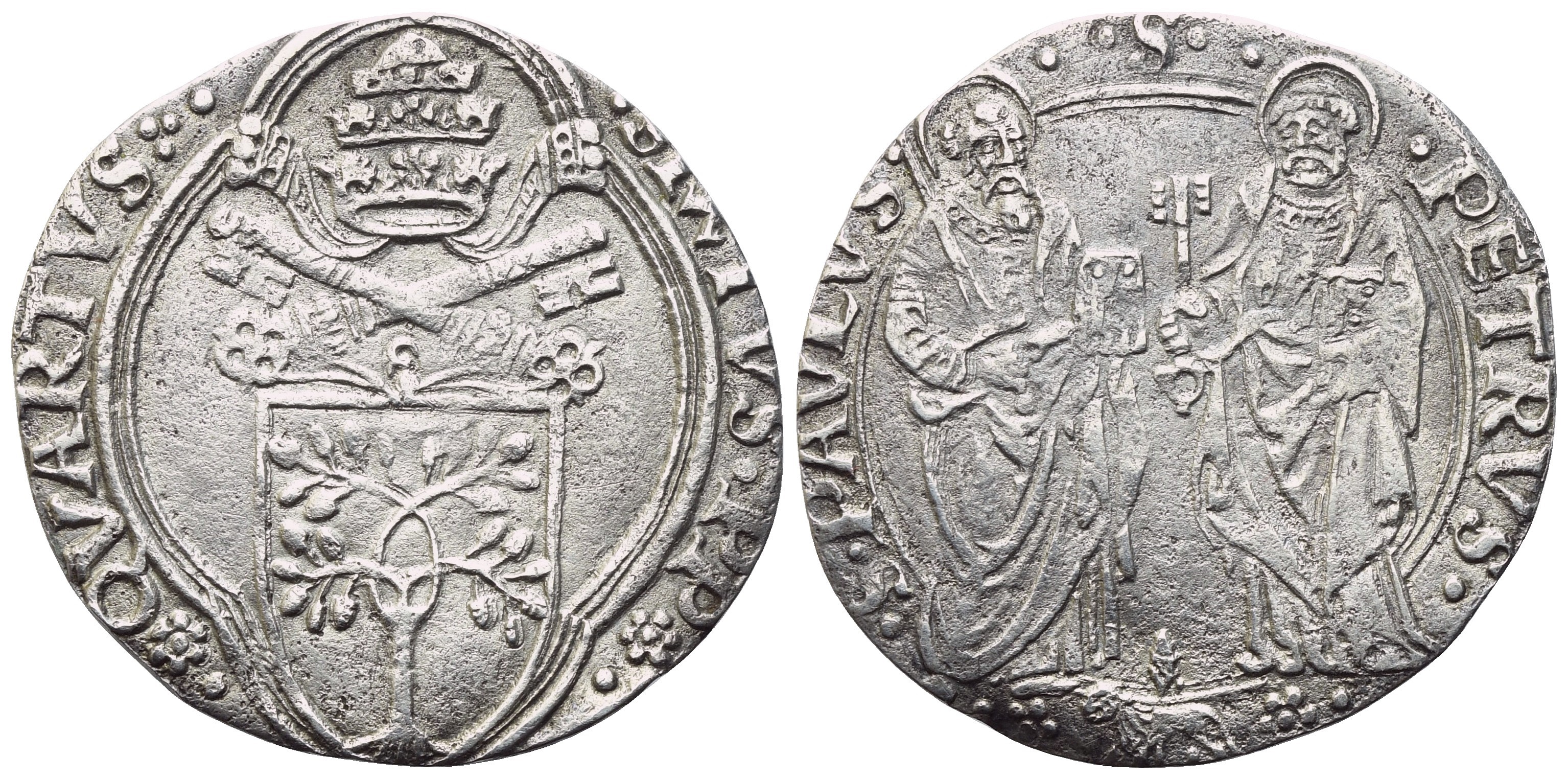 SIXTVS PP QVARTVS Stemma semiovale in quadrilobo. Rv. S PAVLVS S PETRVS San Pietro e San Paolo stanti; sotto, nel giro, leone e palma (arma di Viterbo). CNI 1; Munt. 62. R3. qSPL. Di rara apparizione sul mercato.