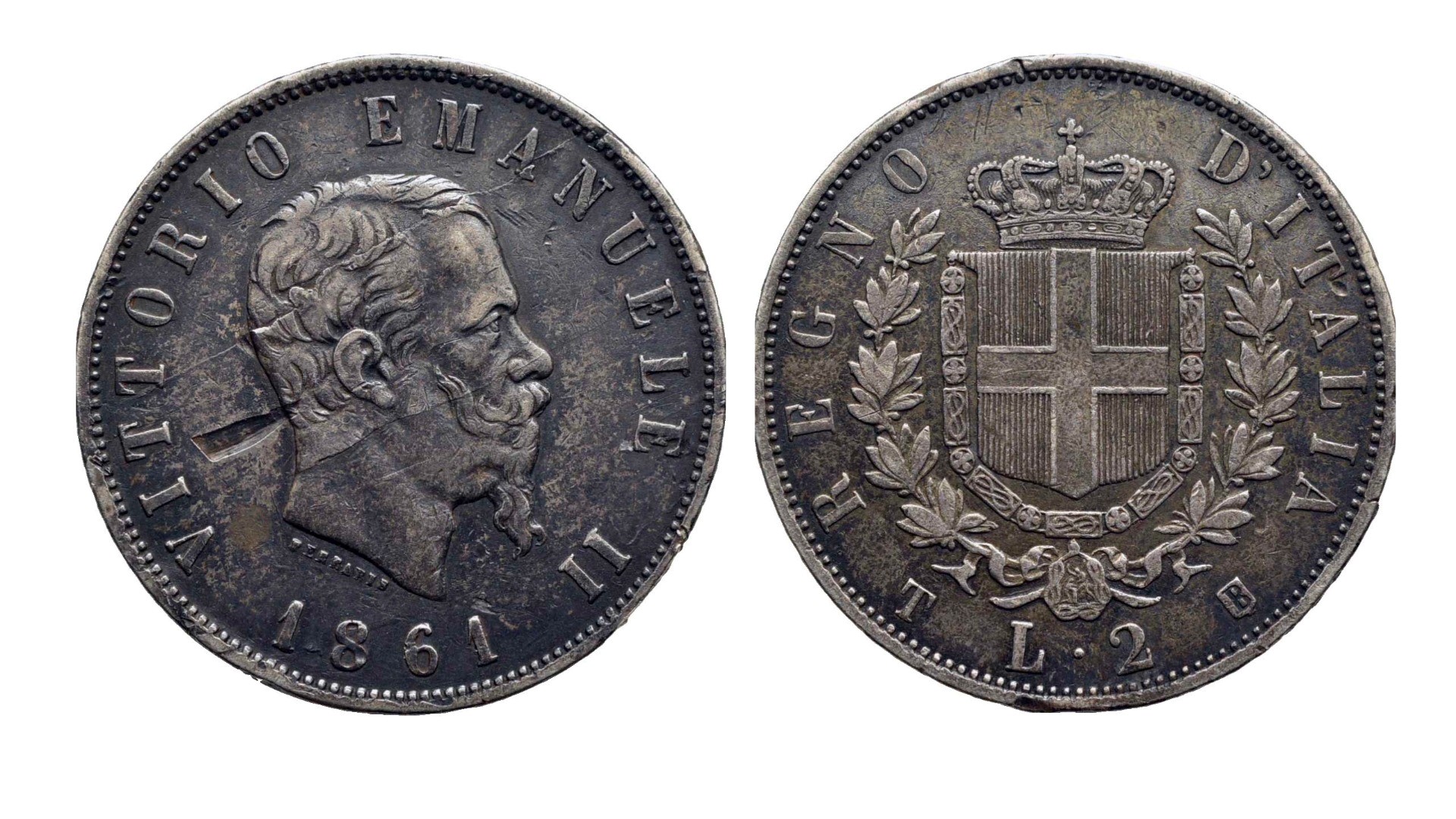 VITTORIO EMANUELE II Testa nuda a destra; sotto il collo, FERRARIS. In basso, 1861. Rv. REGNO D'ITALIA Stemma crociato e coronato, con il Collare dell'Annunziata, tra due rami di lauro; in basso, L 2 tra marchi di zecca. Pag. 504; Mont. 192; Gig. 54. RRR. BB.