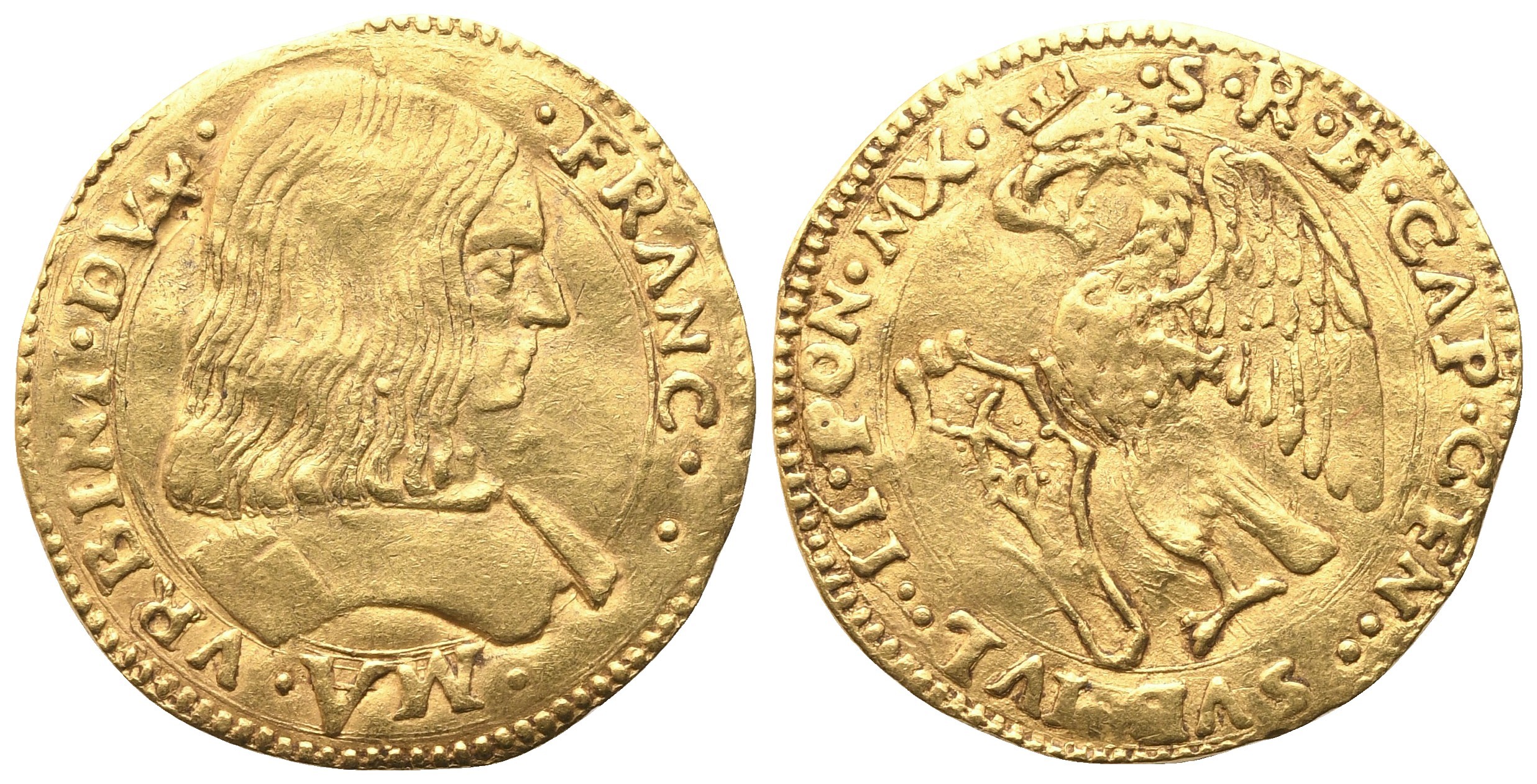 Questo ducato d’oro venne emesso nei primi anni di regno di Francesco Maria I Della Rovere indicato come Sanctae Romanae Ecclesiae Capitaneus Generalis cioè con la carica di comandante e capitano generale delle milizie pontificie sotto il pontefice Giulio II Della Rovere, suo zio, che muore il 21 febbraio 1513. È ignoto il nome dell’artista che incise questa splendida moneta rinascimentale. Il Ravegnani Morosini osservò però che egli seppe interpretare perfettamente «il temperamento di questo principe che accompagnava ad una personalità non elevata una volontà tesa al raggiungimento degli obiettivi prefissati, in una alternanza di imprese ardite, di smarrite debolezze e di fredda prudenza» (M. Ravegnani Morosini, vol . I, p. 84).